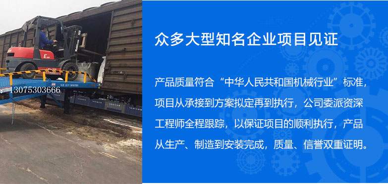 >> 13年的登車橋設(shè)備制造經(jīng)驗(yàn) 集設(shè)計(jì)、研發(fā)、生產(chǎn)和銷售于一體的制造型企業(yè),專業(yè)制造液壓登車橋,移動(dòng)式登 車橋和高空作業(yè)平臺(tái),經(jīng)驗(yàn)豐富,擁有強(qiáng)大的成產(chǎn)技術(shù)和完善的管理模式。 >> 引進(jìn)國際先進(jìn)施工工藝 配備整套專業(yè)自動(dòng)化生成設(shè)備,引進(jìn)國外先進(jìn)技術(shù), 定期培訓(xùn),確保設(shè)備的高品質(zhì)。 產(chǎn)品具有設(shè)計(jì)新穎、結(jié)構(gòu)合理、升降平穩(wěn)、載重安全、操作簡單、維護(hù)方便等優(yōu)點(diǎn)。